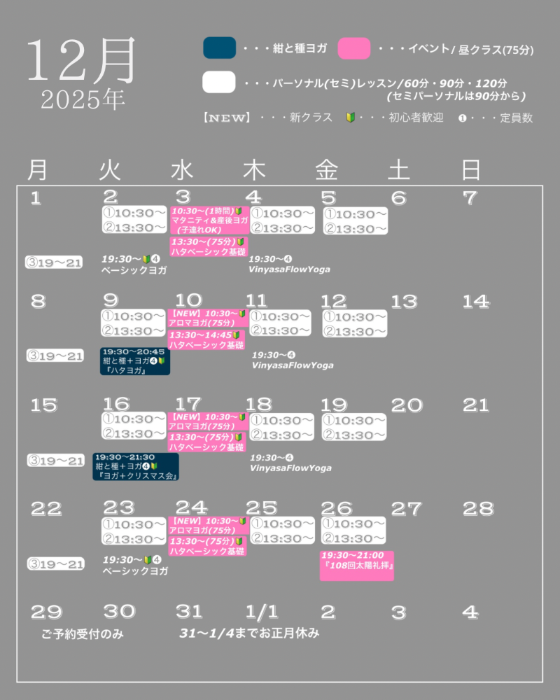 ・通常レッスン以外の時間帯はパーソナル/セミパーソナルレッスンの時間帯となります。①10:30〜②13:30〜。