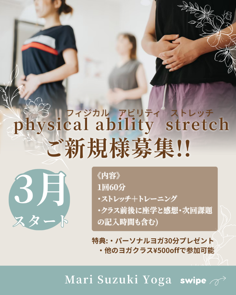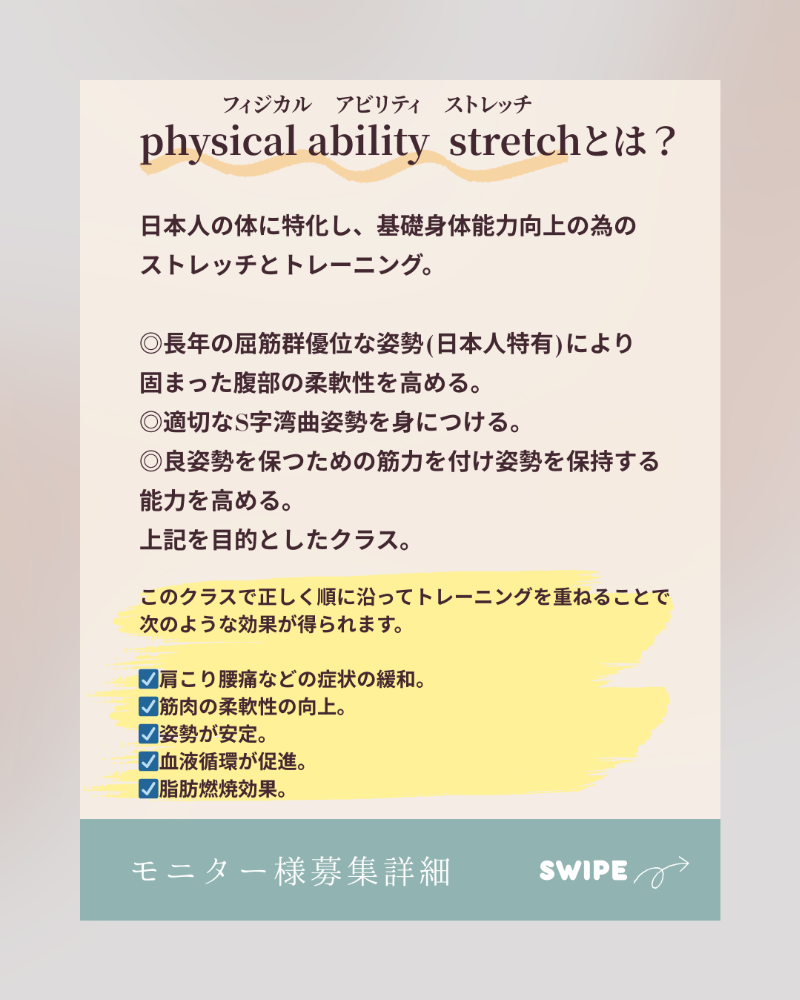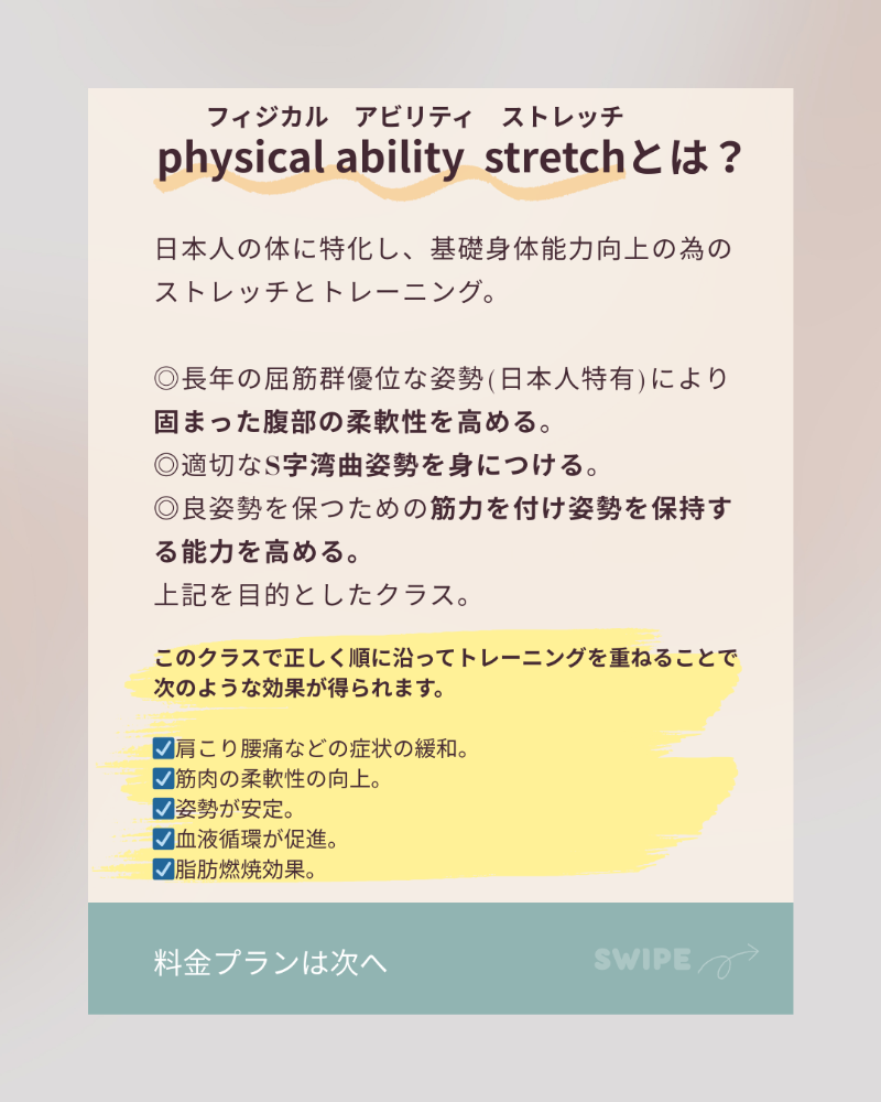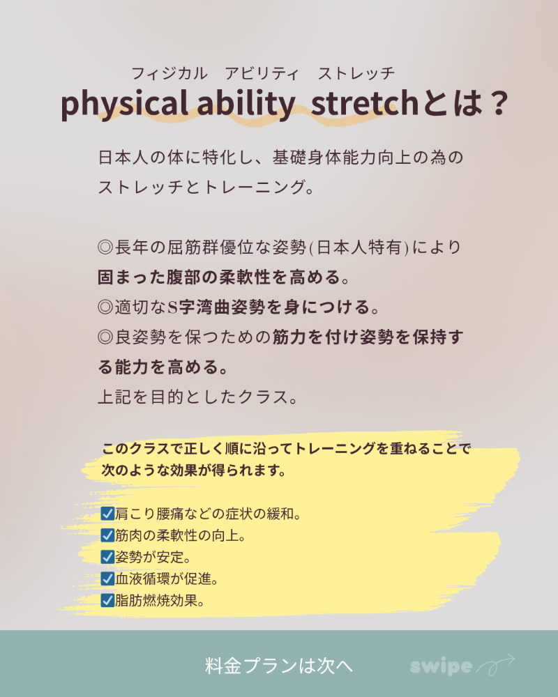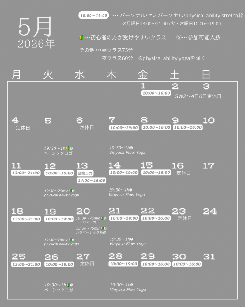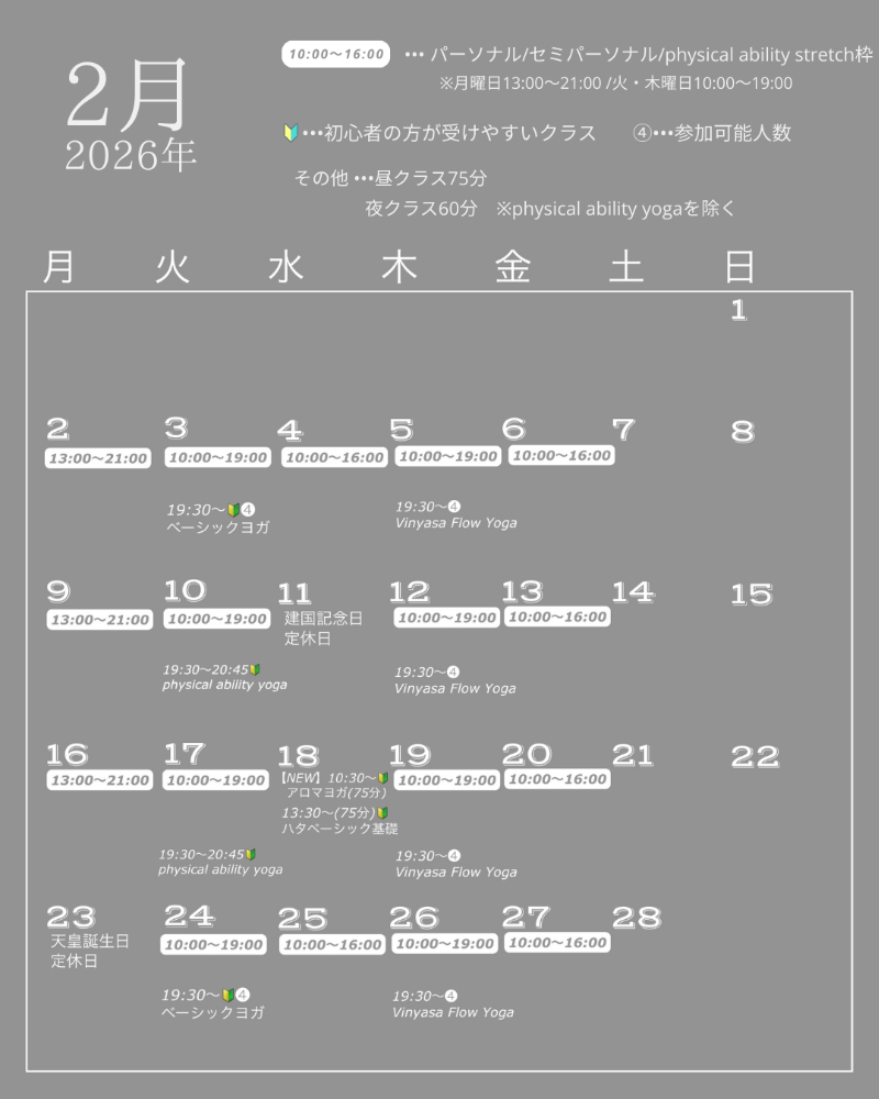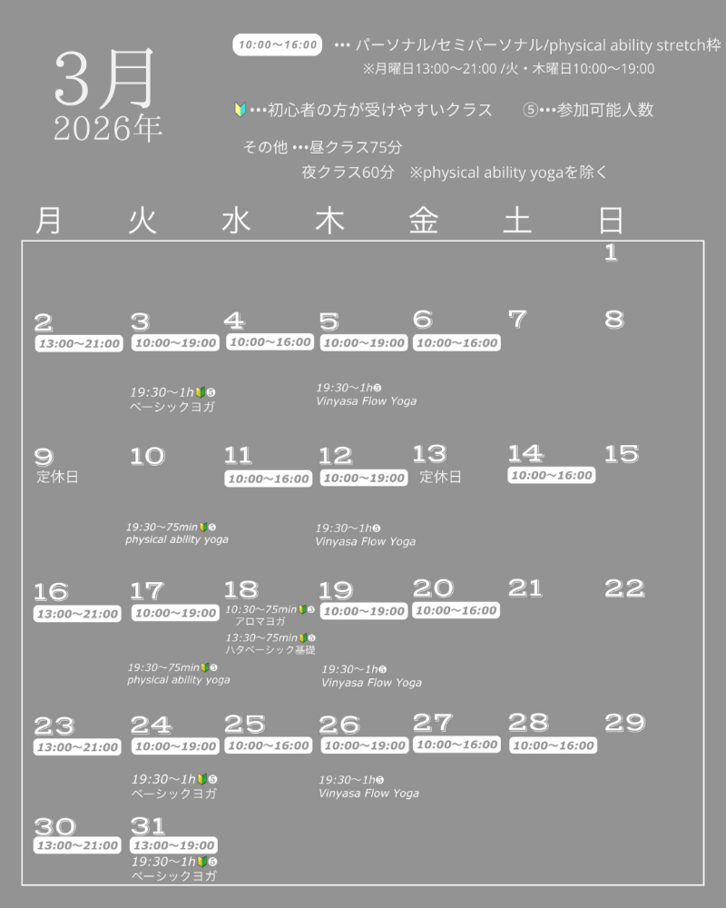 ・日中クラスはパーソナル/physical ability stretchのクラス【10:00〜16:00】※月曜日は13:00〜21:00/水曜日は通常クラス以外の時間帯。