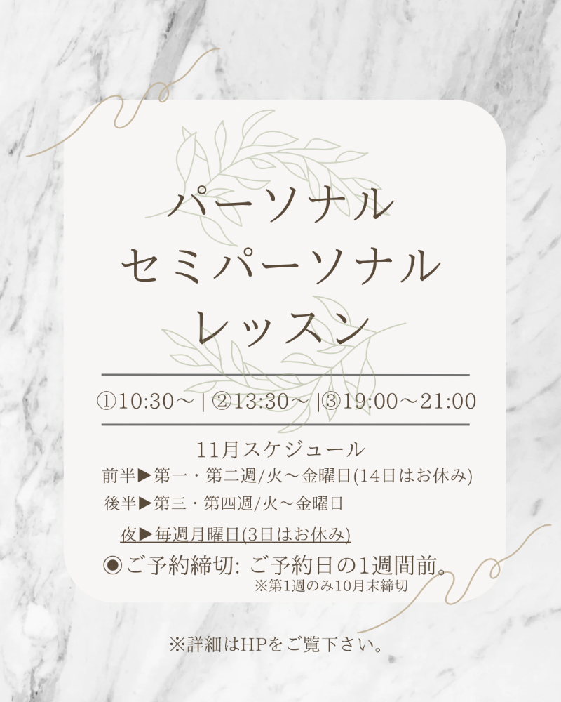 | 毎月のスケジュールを確認頂き、 スタート時間を選択。 ①10:30〜②13:30〜 🔽 パーソナル/セミパーソナルの選択。 🔽 ご希望のお時間120分/90分/60分(セミパーソナルは90分〜)を選択。 🔽 ご予約者さま全員のお名前と代表者さまの繋がるお電話番号を添えてお問い合わせ下さい♪ |