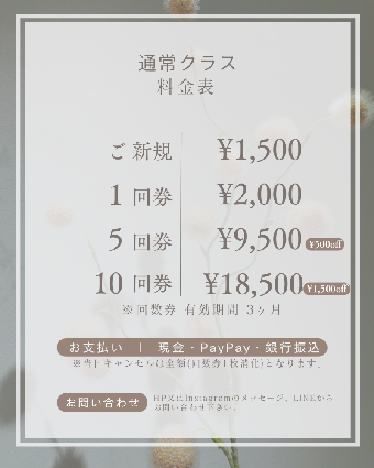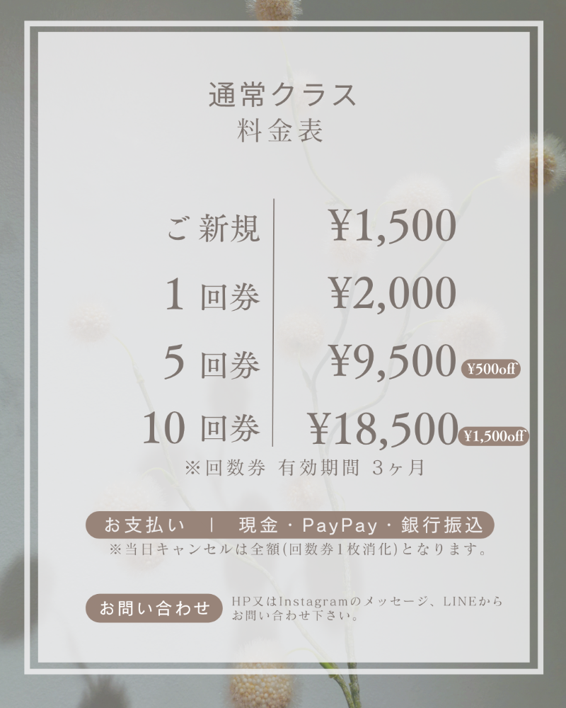 汗拭きタオル、お水、ヨガマット、帰りのお着替え。動きやすい服装。(冬場は防寒対策)