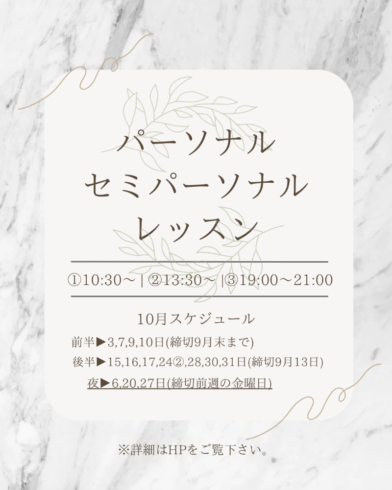 | 毎月のスケジュールを確認頂き、 スタート時間を選択。 ①10:30〜②13:30〜 🔽 パーソナル/セミパーソナルの選択。 🔽 ご希望のお時間120分/90分/60分(セミパーソナルは90分〜)を選択。 🔽 ご予約者さま全員のお名前と代表者さまの繋がるお電話番号を添えてお問い合わせ下さい♪ |