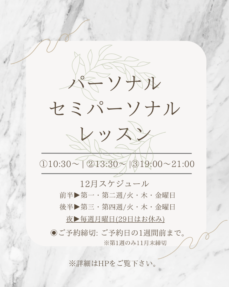 | 毎月のスケジュールを確認頂き、 ホームページのご予約ホームにてスタート時間を選択。 10:00〜15:00(最終開始時間) 🔽 パーソナル/セミパーソナルの選択。 🔽 ご希望のお時間120分/90分/60分(セミパーソナルは90分〜)を選択。 🔽 ご予約者さま全員のお名前と代表者さまの繋がるお電話番号を添えてお問い合わせ下さい♪ |
